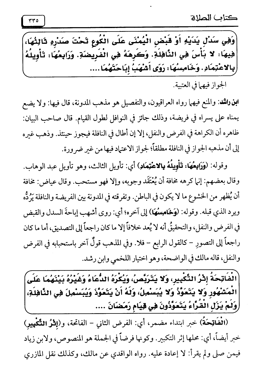 الْفَاتِحَةُ إِثْرُ التَّكْبيرِ، وَلا يَتَرَبَّصُ، وَيُكْرَهُ الدُّعَاءُ وَغَيْرُهُ بَيْنَهُمَا عَلَى الْمَشْهُورِ وَلا يَتَعَوَّذُ وَلا يُبَسْمِلُ، وَلَهُ أَنْ يَتَعَوَّذُ وَيُبَسْمِلُ فِي النَّافِلةِ، وَلَمْ يَزَلِ الْقُرَّاءُ يَتَعَوَّذُونَ فِي قِيَامِ رَمَضَانَ ....