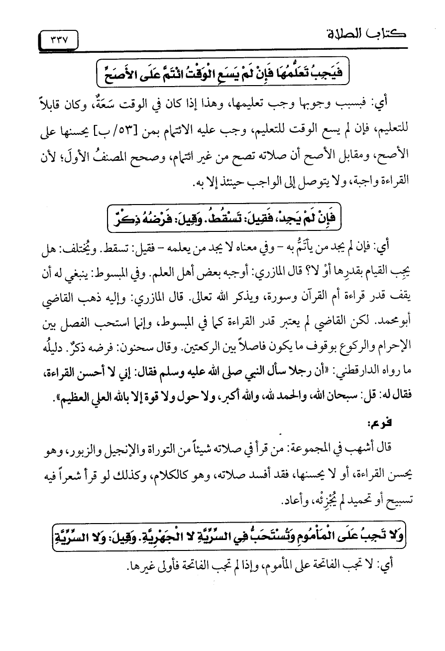 فَيَجِبُ تَعَلُّمِهَا فَإِنْ لَمْ يَسَعِ الْوَقْتُ ائْتَمَّ عَلَى الأَصَحَّ