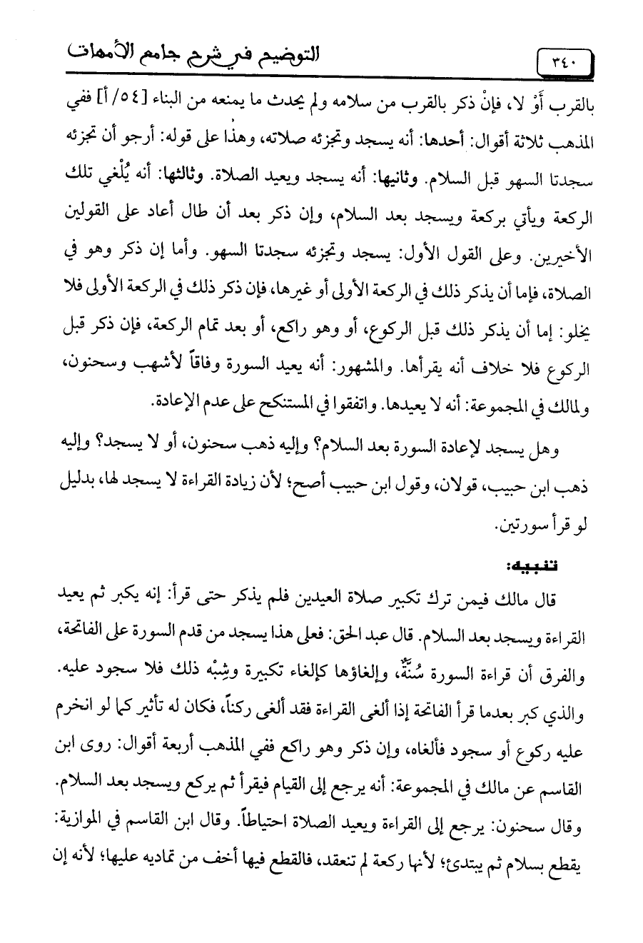 قال مالك فيمن ترك تكبير صلاة العيدين فلم يذكر حتى قرأ: إنه يكبر ثم يُعيد القراءة ويسجد بعد السلام. قال عبد الحق: فعلى هذا يسجد من قدم السورة على الفاتحة، والفرق أن قراءة السورة سنة، وإلغاؤها كإلغاء تكبيرة وشبه ذلك فلا سجود عليه. والذي كبر بعدما قرأ الفاتحة إذا ألغى القراءة فقد ألغى ركنًا، فكان له تأثير كما لو انخرم عليه ركوع أو سجود فألغاه، وإن ذكر وهو راكع ففي المذهب أربعة أقوال: روى ابن القاسم عن مالك في المجموعة: أنه يرجع إلى القيام فيقرأ ثم يركع ويسجد بعد السلام. وقال سحنون: يرجع إلى القراءة ويُعيد الصلاة احتياطًا. وقال ابن القاسم في الموازية: يقطع بسلام ثم يبتدئ؛ لأنها ركعة لم تنعقد، فالقطع فيها أخف من تماديه عليها؛ لأنه إن