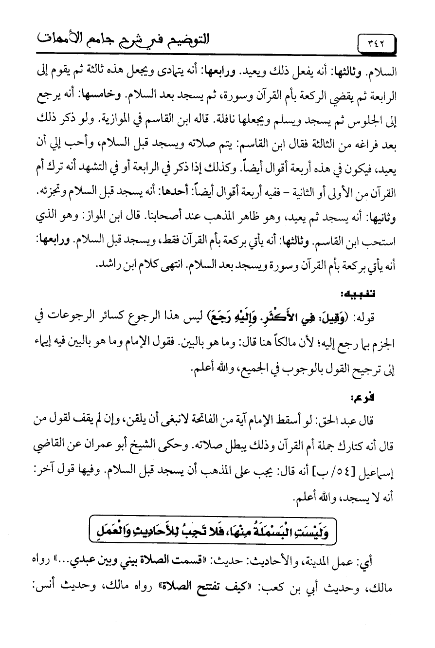 السلام. وثالثها: أنه يفعل ذلك ويُعيد. ورابعها: أنه يتمادى ويجعل هذه ثالثة ثم يقوم إلى الرابعة ثم يقضي الركعة بأم القرآن وسورة، ثم يسجد بعد السلام. وخامسها: أنه يرجع إلى الجلوس ثم يسجد ويسلم ويجعلها نافلة. قاله ابن القاسم في الموازية. ولو ذكر ذلك بعد فراغه من الثالثة فقال ابن القاسم: يتم صلاته ويسجد قبل السلام، وأحب إلى أن يُعيد، فيكون في هذه أربعة أقوال أيضاً. وكذلك إذا ذكر في الرابعة أو في التشهد أنه ترك أم القرآن من الأولى أو الثانية – ففيه أربعة أقوال أيضاً: أحدها: أنه يسجد قبل السلام وتجزئه. وثانيها: أنه يسجد ثم يُعيد، وهو ظاهر المذهب عند أصحابنا. قال ابن المواز: وهو الذي استحب ابن القاسم. وثالثها: أنه يأتي بركعة بأم القرآن فقط، ويسجد قبل السلام ورابعها: أنه يأتي بركعة بأم القرآن وسورة ويسجد بعد السلام. انتهى كلام ابن راشد.