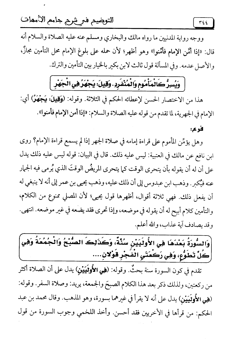وهل يؤمن المأموم على قراءة إمامه في صلاة الجهر إذا لم يسمع قراءة الإمام؟ روى ابن نافع عن مالك في العتبية: ليس عليه ذلك. قال في البيان: قوله ليس عليه ذلك يدل على أن له أن يقول بأن يتحرى الوقت كما يتحرى المريض الوقت الذي يرمي فيه الجمار عنه فيكبر. وذهب ابن عبدوس إلى أن ذلك عليه، وذهب يحيى بن عمر إلى أنه لا ينبغي له أن يفعل ذلك. فهي ثلاثة أقوال، أظهرها قول يحيى؛ لأن المصلي ممنوع من الكلام، والتأمين كلام أبيح له أن يقول في موضعه، وإذا تحرى فقد يضعه في غير موضعه. انتهى.