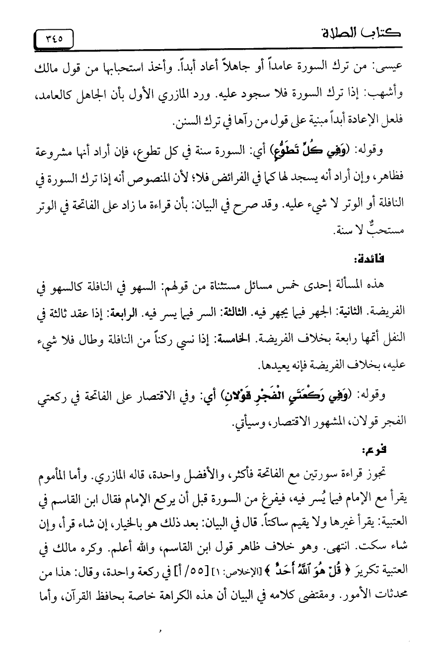 عيسى: من ترك السورة عامدًا أو جاهلاً أعاد أبدً. وأخذ استحبابها من قول مالك وأشهب: إذا ترك السورة فلا سجود عليه. ورد المازري الأول بأن الجاهل كالعامد، فلعل الإعادة أبداً مبنية على قول من رآها في ترك السنن.