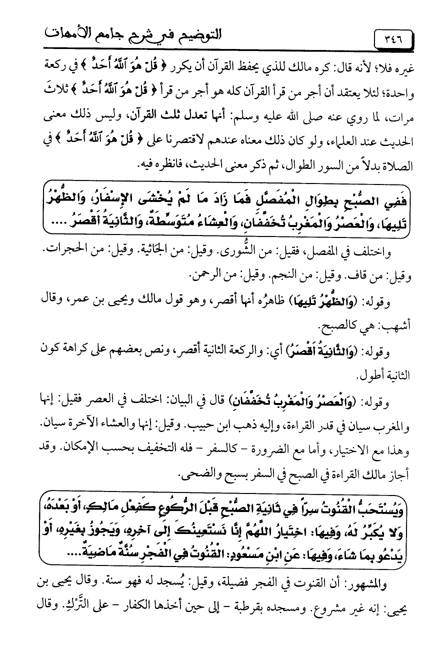 والْمَشْهُورِ: أن القنوات في الفجر فضيلة، وقيل: يُسجد له فهو سنة. وقال يحيى بن يحيى: إنه غير مشروع. ومسجده بقرطبة – إلى حين أخذها الكفار – على الترك. وقال