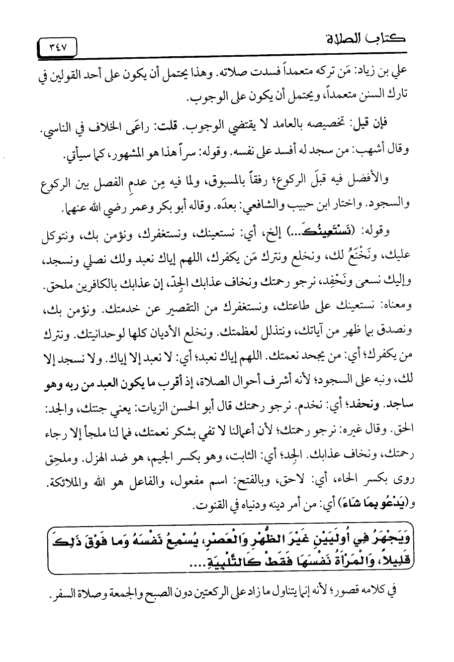 وَيَجْهَرُ فِي أُولَيَيْنِ غَيْرَ الظُّهْرِ وَالْعَصْرِ، يُسْمِعُ نَفْسَهُ وَما فَوْقَ ذَلِكَ قَلِيلاً، وَالْمَرْأَةُ نَفْسَهَا فَقَطْ كَالتَّلْبِيَةِ .......