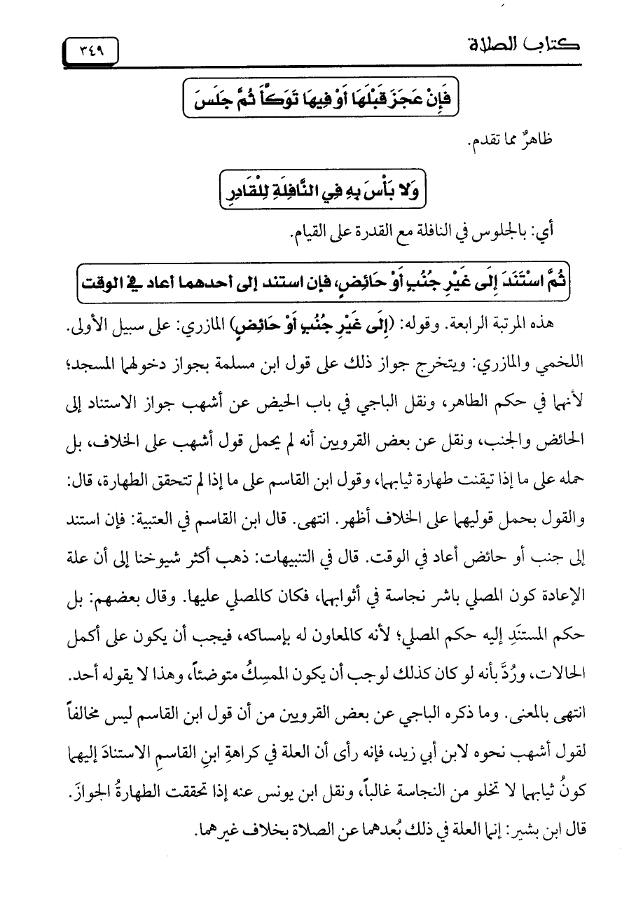 هذه المرتبة الرابعة. وقوله: (إِلَى غَيْرِ جُنُبٍ أَوْ حَائِضٍ) المازري: على سبيل الأولى. اللخمي والمازري: ويتخرج جواز ذلك على قول ابن مسلمة بجواز الاستناد إلى الحائض والجنب، ونقل عن بعض القرويين أنه لم يحمل قول أشهب على الخلاف، بل حمله على ما إذا تيقنت طهارة ثيابهما، وقول ابن القاسم على ما إذا لم تتحقق الطهارة، قال: والقول بحمل قوليهما على الخلاف أظهر. انتهى. قال ابن القاسم في العتبية: فإن استند إلى جنب أو حائض أعاد في الوقت. قال في التنبيهات: ذهب أكثر شيوخنا إلى أن علة الإعادة كون المصلي باشر نجاسة في أثوابهما، فكان كالمصلي عليها. وقال بعضهم: بل حكم المستند إليه حكم المصلي؛ لأنه كالمعاون له بإمساكه، فيجب أن يكون على أكمل الحالات، ورد بأنه لو كان كذلك لوجب أن يكون الممسك متوضئًا، وهذا لا يقوله أحد. انتهى بالمعنى. وما ذكره الباجي عن بعض القرويين من أن قول ابن القاسم ليس مخالفًا لقول أشهب نحوه لابن أبي زيد، فإنه رأى أن العلة في كراهة ابن القاسم الاستناد إليهما كون ثيابهما لا تخلو من النجاسة غالبًا، ونقل ابن يونس عنه إذا تحققت الطهارة الجواز. قال ابن بشير: إنما العلة في ذلك بعدهما عن الصلاة بخلاف غيرهما.