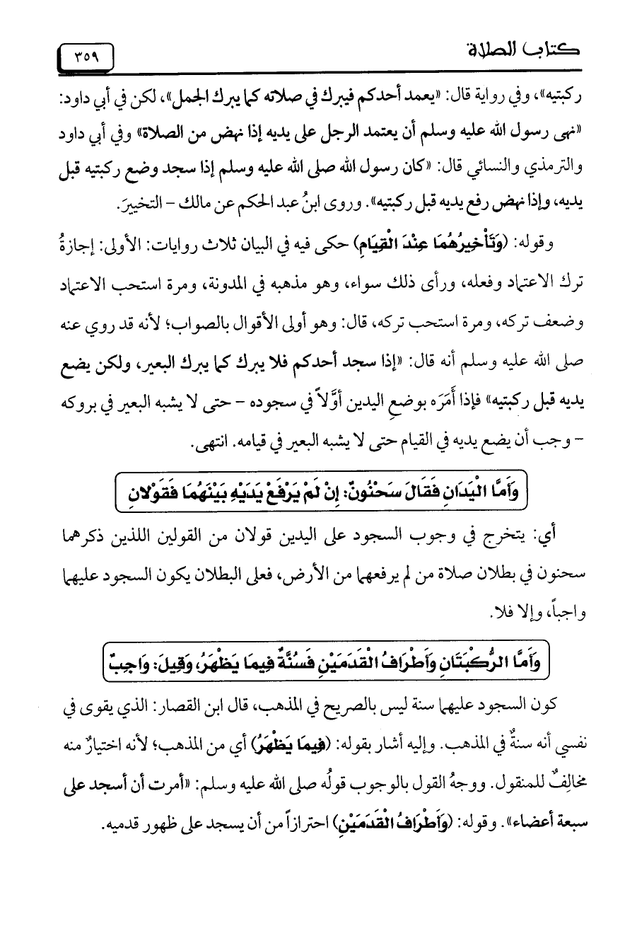 ركبتيه"، وفي رواية قال: "يعمد أحدكم فيبرك في صلاته كما يبرك الجمل"، لكن في أبي داود: "نهى رسول الله صلى الله عليه وسلم أن يعتمد الرجل على يديه إذا نهض من الصلاة" وفي أبي داود والترمذي والنسائي قال: "كان رسول الله صلى الله عليه وسلم إذا سجد وضع ركبتيه ققبل يديه، وإذا نهض رفع يديه قبل ركبتيه". وروى ابن عبد الحكم عن مالك – التخيير.
