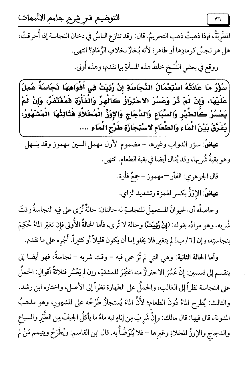 سُؤْرُ مَا عَادَتُهُ اسْتِعْمَالُ النَّجَاسَةِ إِنْ رُئِيَتْ فِي أَفْوَاهِهَا نَجَاسَةٌ عُمِلَ عَلَيْهَا، وَإِنْ لَمْ تُرَ وَعَسُرَ الاحْتِرَازُ كَالْهِرِّ وَالْفَارَةِ فَمُغْتَفرٌ، وَإِنْ لَمْ يَعْسُرْ كَالطِّيْرِ وَالسِّبَاعِ وَالدَّجَاجِ وَالإِوَزِّ الْمُخَلاَّةِ فَثَالِثُهَا الْمَشْهُورِ: يُفَرَّقُ بَيْنَ الْمَاءِ وَالطَّعَامِ لاسْتِجَازَةِ طَرْحِ الْمَاءِ ....