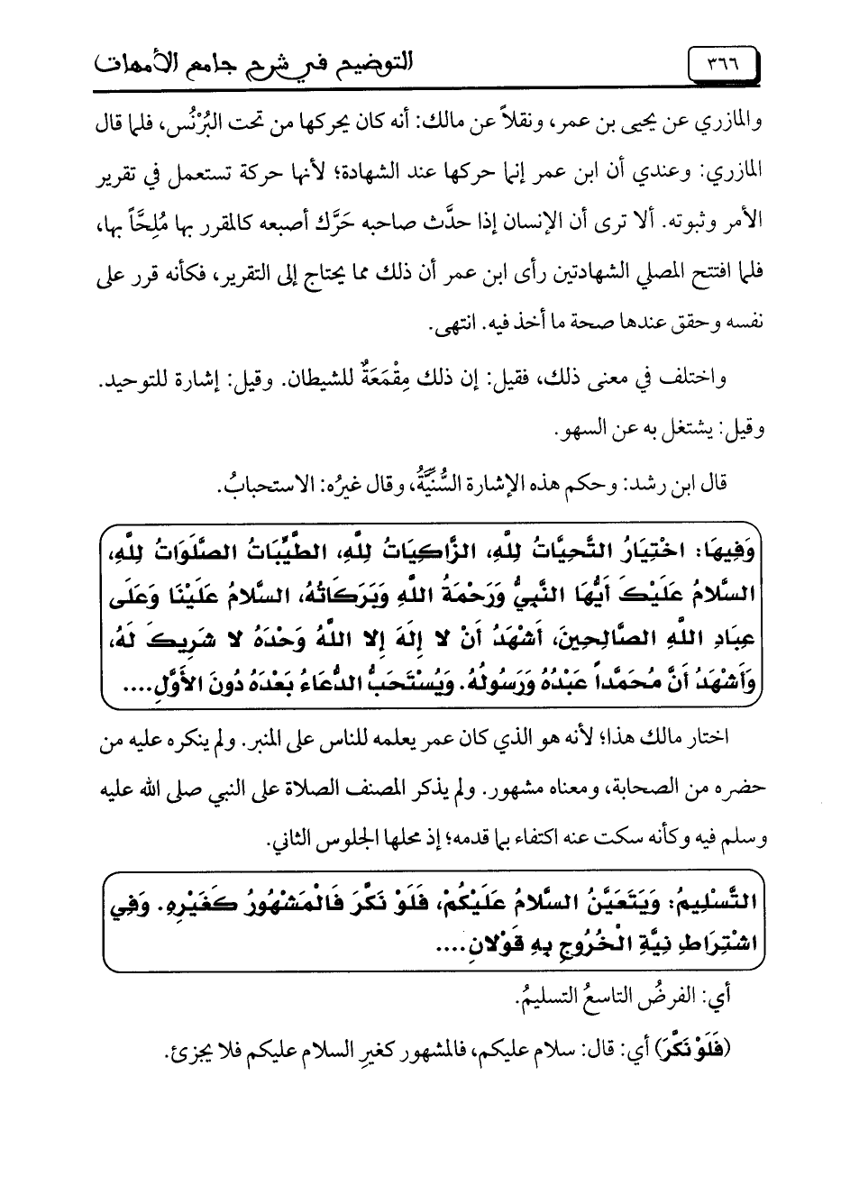 والمازري عن يحيى بن عمر، ونقلاً عن مالك: أنه كان يحركها من تحت البُرْنُس، فلما قال المازري: وعندي أن ابن عمر إنما حركها عند الشهادة؛ لأنها حركة تستعمل في تقرير الأمر وثبوته. ألا ترى أن الإنسان إذا حدَّث صاحبه حَرَّك أصبعه كالمقرر بها مُلِحًّا بها، فلما افتتح المصلي الشهادتين رأى ابن عمر أن ذلك مما يحتاج إلى التقرير، فكأنه قرر على نفسه وحقق عندها صحة ما أخذ فيه. انتهى.