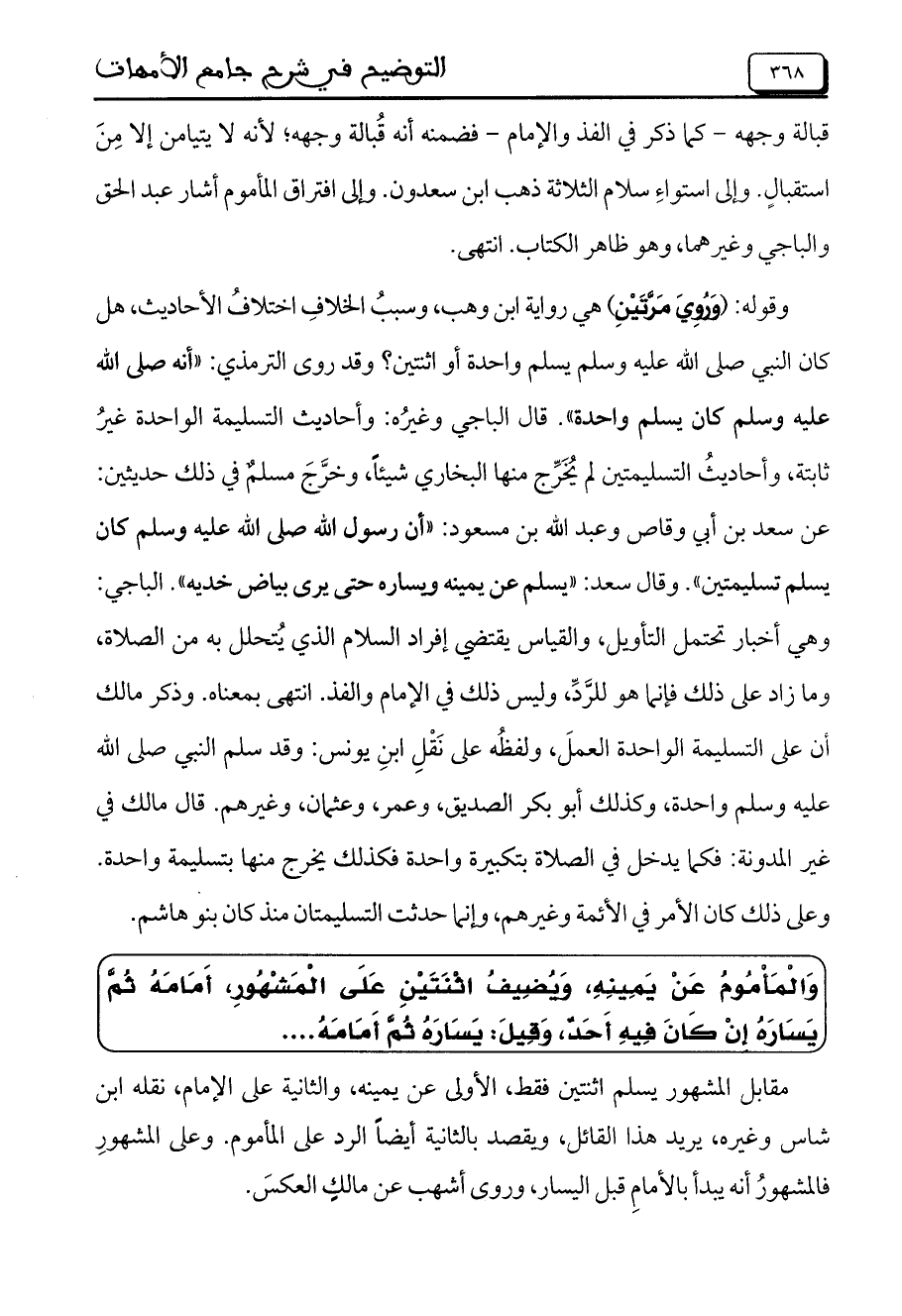 قبالة وجهه– كما ذكر في الفذ والإمام– فضمنه أنه قُبالة وجهه؛ لأنه لا يتيامن إلا مِنَ استقبالٍ. وإلى استواءِ سلام الثلاثة ذهب ابن سعدون. وإلى افتراق المأموم أشار عبد الحق والباجي وغيرهما، وهو ظاهر الكتاب. انتهى.