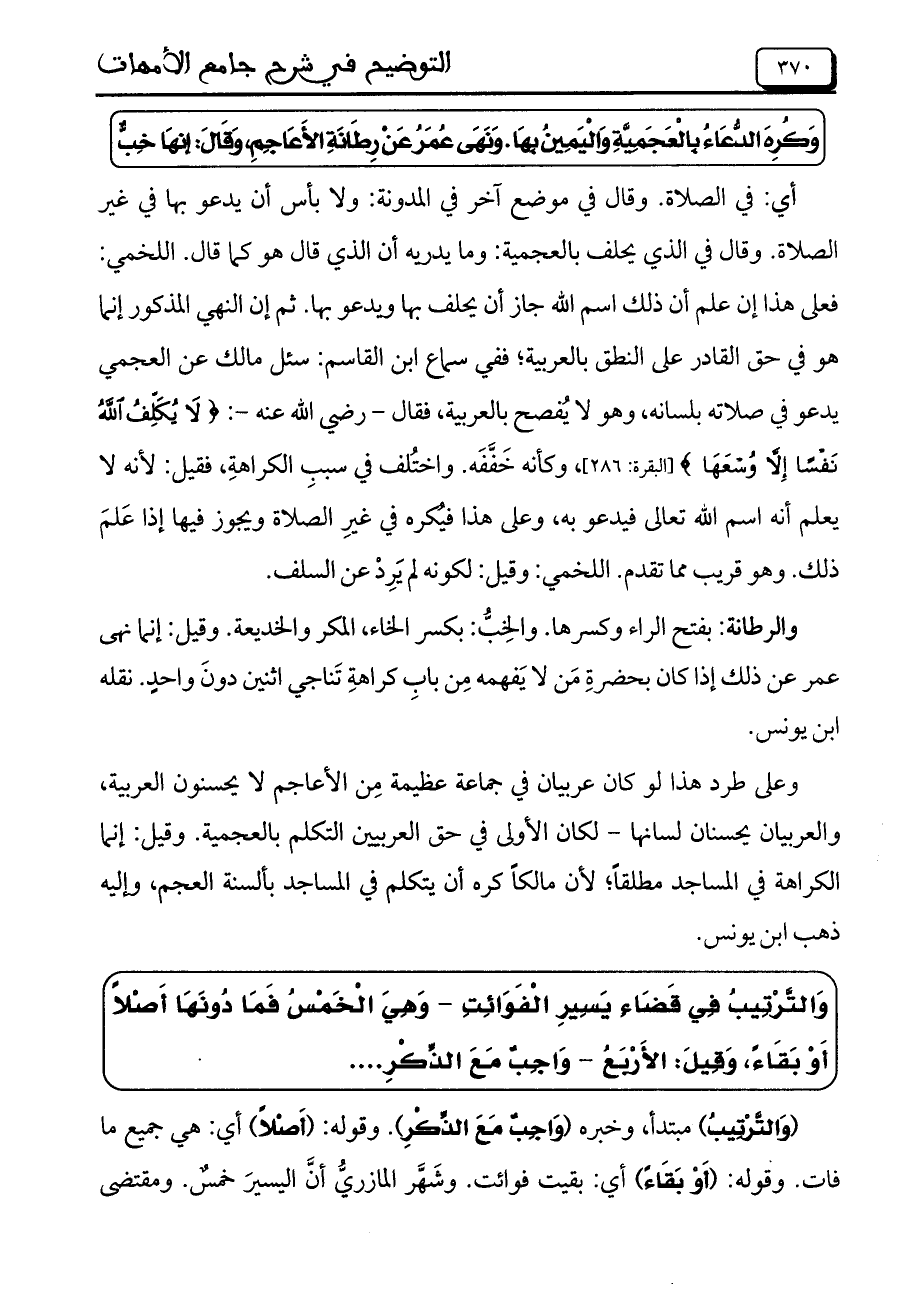 أي: في الصلاة. وقال في موضع آخر في المدونة: ولا بأس أن يدعو بها في غير الصلاة. وقال في الذي يحلف بالعجمية: وما يدريه أن الذي قال هو كما قال. اللخمي: فعلى هذا إن علم أن ذلك اسم الله جاز أن يحلف بها ويدعو بها. ثم إن النهي المذكور إنما هو في حق القادر على النطق بالعربية؛ ففي سماع ابن القاسم: سئل مالك عن العجمي يدعو في صلاته بلسانه، وهو لا يُفصح بالعربية، فقال –رضي الله عنه-: {لَا يُكَلِّفُ اللَّهُ نَفْسًا إِلَّا وُسْعَهَا} [البقرة: 286]، وكأنه خَفَّفَه. واختُلف في سبب الكراهةِ، فقيل: لأنه لا يعلم أنه اسم الله تعالى فيدعو به، وعلى هذا فيُكره في غيرِ الصلاة ويجوز فيها إذا علم ذلك. وهو قريب مما تقدم. اللخمي: وقيل: لكونه لم يَرِدْ عن السلف.