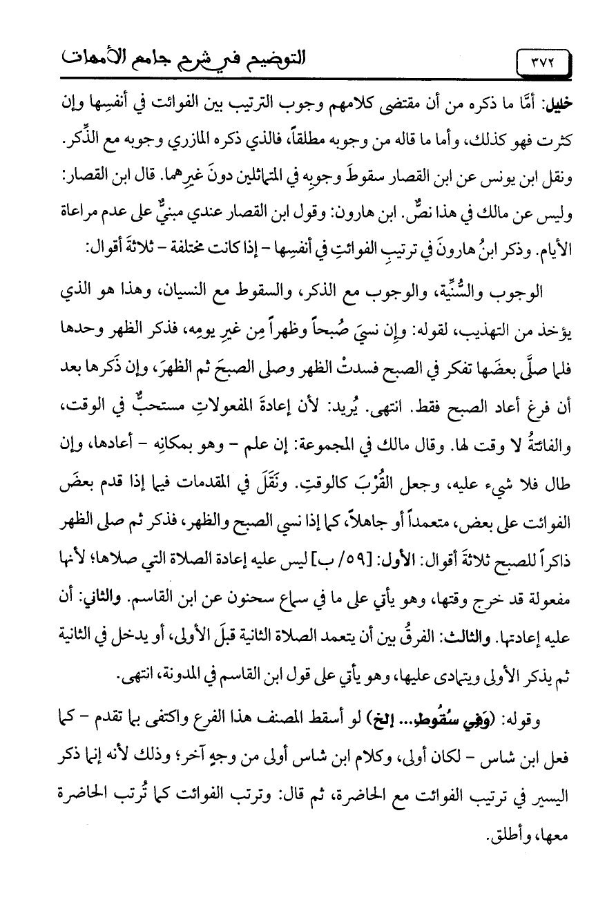 خليل: أمَّا ما ذكره من أن مقتضى كلامهم وجوب الترتيب بين الفوائت في أنفسها وإن كثرت فهو كذلك، وأما ما قاله من وجبوه مطلقاً، فالذي ذكره المازري وجوبه مع الذكر. ونقل ابن يونس عن ابن القصار سقوطَ وجوبِه في المتماثلين دونَ غيرِهما. قال ابن القصار: وليس عن مالك في هذا نصٌّ. ابن هارون: وقول ابن القصار عندي مبنيٌّ على عدم مراعاة الأيام. وذكر ابنُ هارون في ترتيب الفوائت في أنفسها– إذا كانت مختلفة – ثلاثة أقوال: