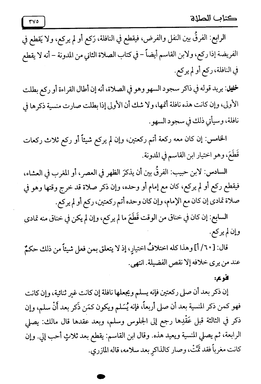 الرابع: الفرقُ بين النفل والفرض، فيقطع في النافلة، رَكع أو لم يركع، ولا يَقطع في الفريضة إذا ركع، ولابن القاسم أيضاً –في كتاب الصلاة الثاني من المدونة– أنه لا يقطع في النافلة، ركع أو لم يركع.
