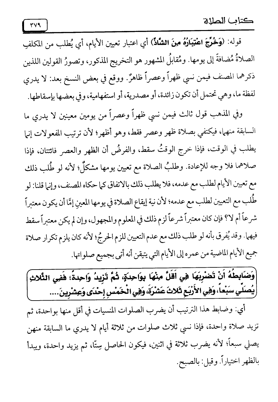 أي: وضابط هذا الترتيب أن يضرب الصلوات المنسيات في أقل منها بواحدة، ثم تزيد صلاة واحدة، فإذا نسي ثلاث صلوات من ثلاثة أيام لا يدري ما السابقة منهن يصلي سبعًا؛ لأنه يضرب ثلاثة في اثنين، فيكون الحاصل سِتًا، ثم يزيد واحدة، ويبدأ بالظهر اختيارًا. وقيل: بالصبح.