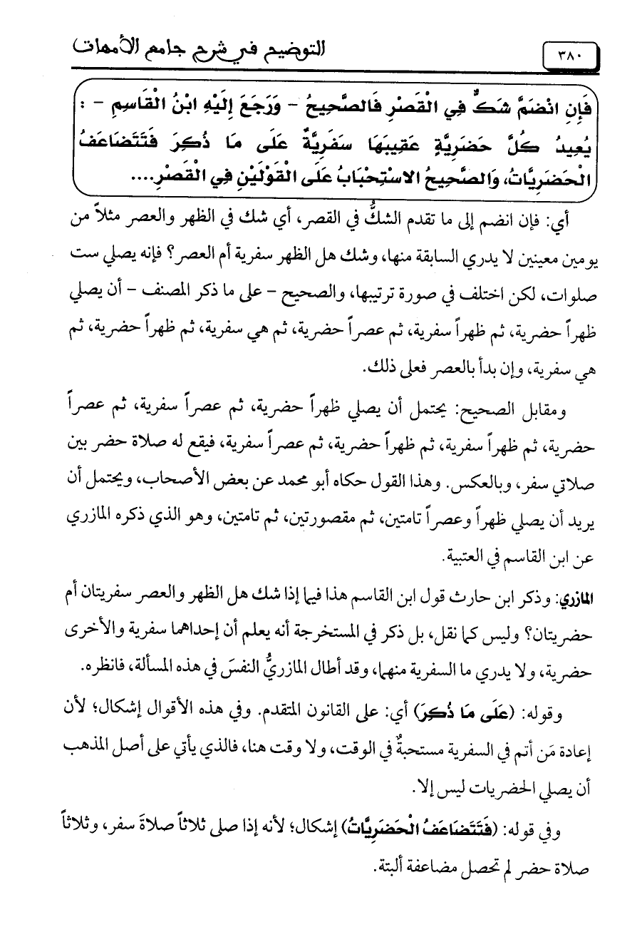 المازري: وذكر ابن حارث قول ابن القاسم هذا فيما إذا شك هل الظهر والعصر سفريتان أم حضريتان؟ وليس كما نقل، بل ذكر في المستخرجة أنه يعلم أن إحداهما سفرية والأخرى حضرية، ولا يدري ما السفرية منهما، وقد أطال المازريُّ النفسَ في هذه المسألة، فانظره.