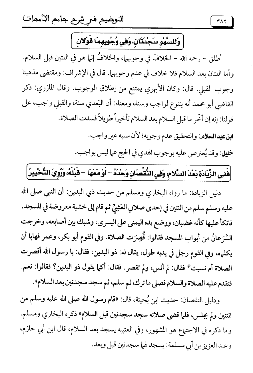 دليل الزيادة: ما رواه البخاري ومسلم من حديث ذي اليدين: أن النبي صلى الله عليه وسلم سلم من اثنتين في إحدى صلاتي العَشِيِّ ثم قام إلى خشبة معروضة في المسجد، فاتكأ عليها كأنه غضبان، ووضع يده اليمنى على اليسرى، وشبك بين أصابعه، وخرجت السَّرَعانُ من أبواب المسجد فقالوا: قُصِرَت الصلاة. وفي القوم أبو بكر، وعمر فهابا أن يكلماه، وفي القوم رجل في يديه طول، يقال له: ذو اليدين، فقال: يا رسول الله أقصرت الصلاة أم نسيت؟ فقال: لم أنس، ولم تقصر. فقال: أكما يقول ذو اليدين؟ فقالوا: نعم. فتقدم عليه الصلاة والسلام فصلى ما ترك، ثم سلم، ثم سجد سجدتين بعد السلام)).