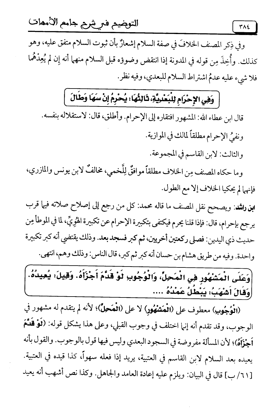 ابن راشد: ويصحح نقل المصنف ما قاله محمد: كل من رجع إلى إصلاح صلاته فيما قرب يرجع بإحرام، قال: فإذا قلنا يحرم فيكتفي بتكبيرة الإحرام عن تكبيرة الهُوِيِّ، لما في الموطأ من حديث ذي اليدين: فصلى ركعتين أخريين، ثم كبر فسجد بعد. وذلك يقتضي أنه كبر تكبيرة واحدة. وفيه من طريق هشام بن حسان أنه كبر ثم كبر، قال الناس: وذلك وهم، انتهى.