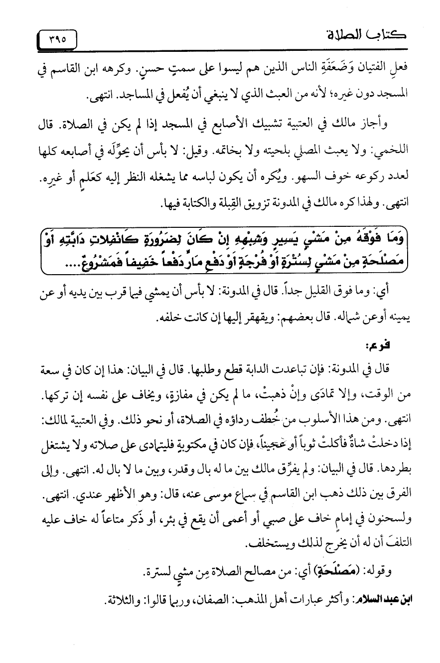 وأجاز مالك في العتبية تشبيك الأصابع في المسجد إذا لم يكن في الصلاة. قال اللخمي: ولا يعبث المصلي بلحيته ولا بخاتمه. وقيل: لا بأس أن يحوله في أصابعه كلها لعدد ركوعه خوف السهو. ويُكره أن يكون لباسه مما يشغله النظر إليه كعَلمٍ أو غيرِه. انتهى. ولهذا كره مالك في المدونة تزويق القبلة والكتابة فيها.
