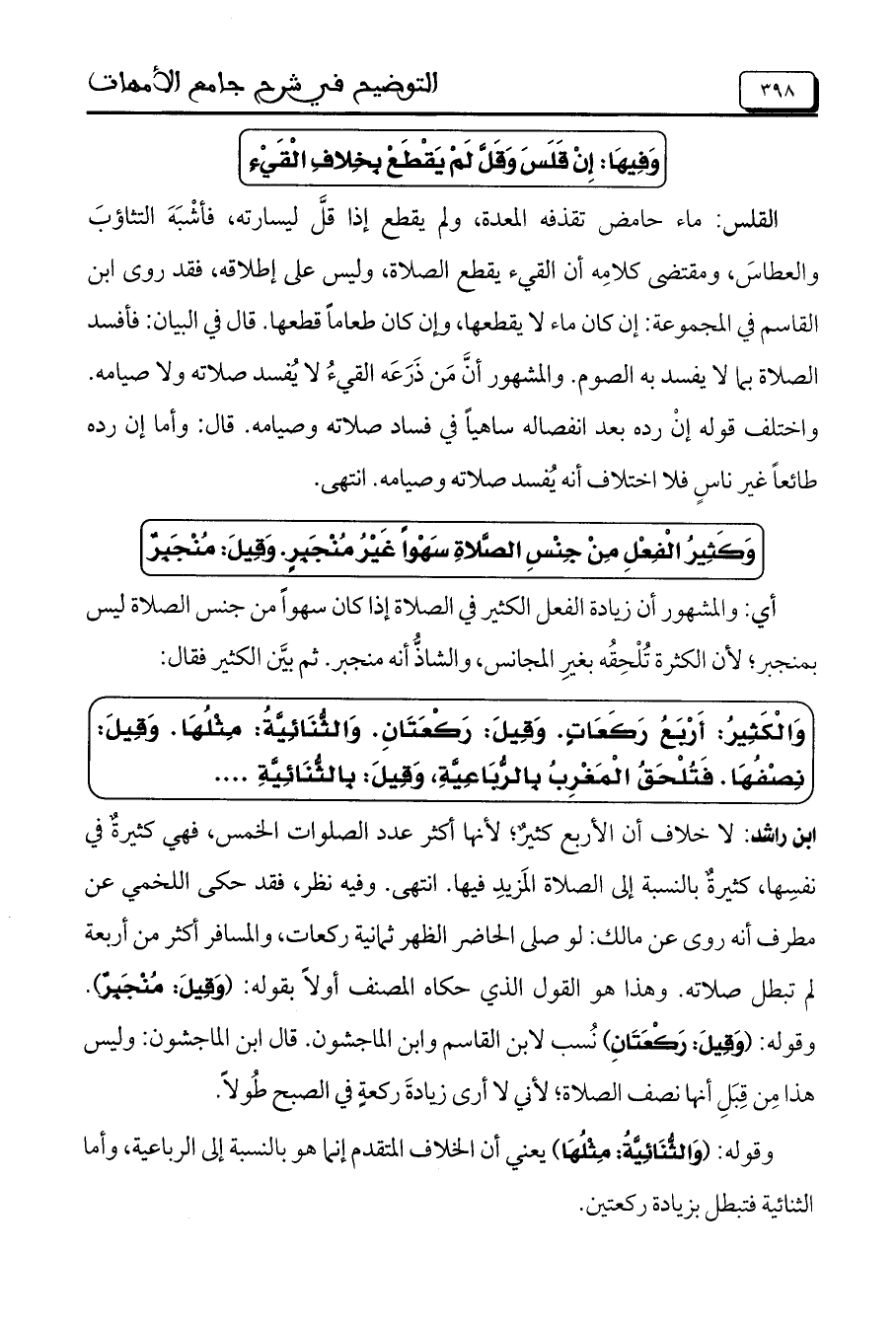 القلس: ماء حامض تقذفه المعدة، ولم يقطع إذا قلَّ لسيارته، فأشْبَهَ التثاؤبَ والعطاسَ، ومقتضى كلامِه أن القيء يقطع الصلاة، وليس على إطلاقه، فقد روى ابن القاسم في المجموعة: إن كان ماء لا يقطعها، وإن كان طعاماً قطعها. قال في البيان: فأفسد الصلاة بما لا يفسد به الصوم. والمشهور أنَّ مَن ذَرَعَه القيءُ لا يُفسد صلاته ولا صيامه. واختلف قوله إنْ رده بعد انفصاله ساهياً في فساد صلاته وصيامه. قال: وأما إن رده طائعاً غير ناسٍ فلا اختلاف أنه يُفسد صلاته وصيامه. انتهى.