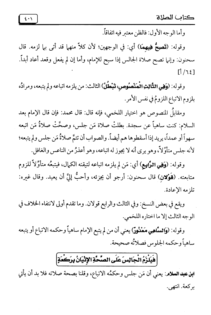 ابن عبد السلام: يعني أن مَن جلس وحكمُه الإتباع، وقلنا بصحة صلاته فلا بد أن يأتي بركعة. انتهى.
