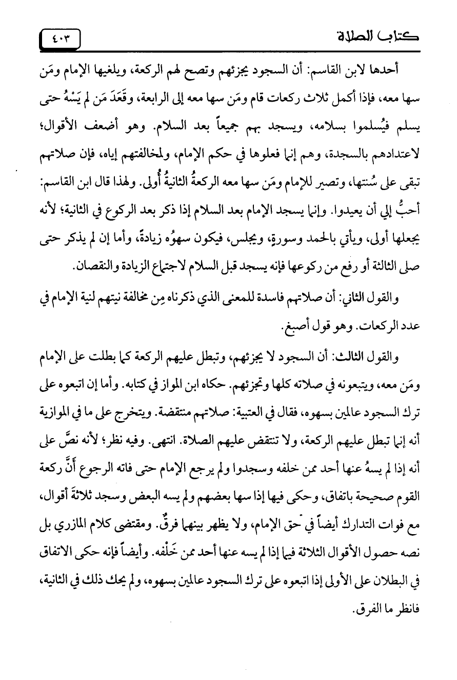 والقول الثالث: أن السجود لا يجزئهم، وتبطل عليهم الركعة كما بطلت على الإمام ومَن معه، ويتبعونه في صلاته كلها وتجزئهم. حكاه ابن المواز في كتابه. وأما إن اتبعوه على ترك السجود عالمين بسهوه، فقال في العتبية: صلاتهم مِنتقضة. ويتخرج على ما في الموازية أنه إنما تبطل عليهم الركعة، ولا تنتقص عليهم الصلاة. انتهى. وفيه نظر؛ لأنه نص على أنه إذا لم يسهُ عنها أحد ممن خلفه وسجدوا ولم يرجع الإمام حتى فاته الرجوع أَنَّ ركعة القوم صحيحة باتفاق، وحكى فيها إذا سها بعضهم ولم يسه البعض ويجد ثلاثةَ أقوال، مع فوات التدارك أيضاً في حق الإمام، ولا يظهر بينهما فرقٌ. ومقتضى كلام المازري بل نصه حصول الأقوال الثلاثة فيما إذا لم يسه عنها أحد ممكن خَلْفه. وأيضاً فإنه حكى الاتفاق في البطلان على الأولى إذا اتبعوه على ترك السجود عالمين بسهوه، ولم يحك ذلك في الثانية، فانظر ما الفرق.