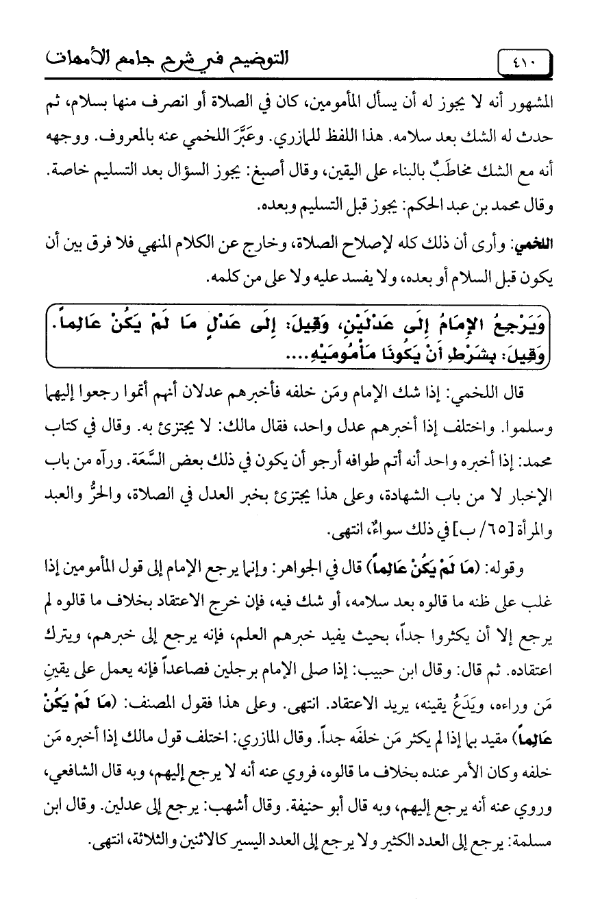 وَيَرْجِعُ الإِمَامُ إِلَى عَدْلَيْنِ، وَقِيلَ: إِلَى عَدْلٍ مَا لَمْ يَكُنْ عَالِماً. وَقِيلَ: بِشَرْطِ أَنْ يَكُونَا مَأمُومَيْهِ ......