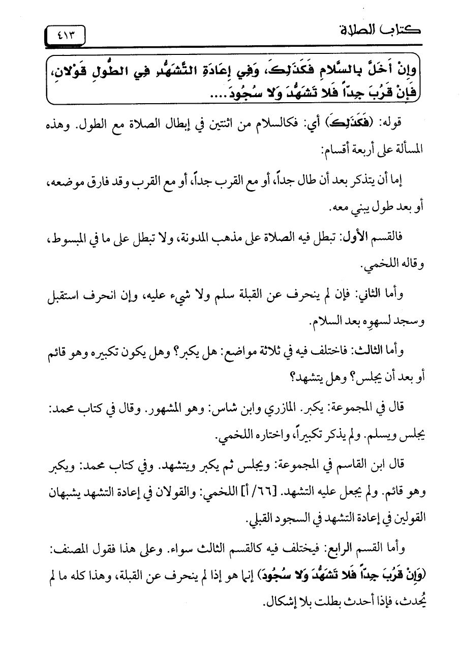وأما القسم الرابع: فيختلف فيه كالقسم الثالث سواء. وعلى هذا فقول المصنف: (وَإِنْ قَرُبَ جِدّاً فَلا تَشَهُّدَ وَلا سُجُودَ) إنما هو إذا لم ينحرف عن القبلة، وهذا كله ما لم يحدث، فإذا أحدث بطلت بلا إشكال.