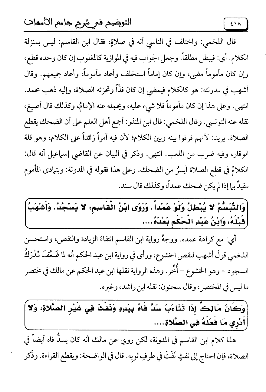 قال اللخمي: واختلف في الناسي أنه في صلاةٍ، فقال ابن القاسم: ليس بمِنزله الكلام. أي: فيبطل مطلقاً. وجعل الجواب فيه في الموازية كالمغلوب إن كان وحده قطع، وإن كان مأموماً مضى، وإن كان إماماً استخلف وأعاد مأموماً، وأعاد جميعهم. وقال أشهب في مدونته: هو كالكلام فيمضى إن كان فَذّاً وتجرئه الصلاة، وإليه ذهب محمد. انتهى. وعلى هذا إن كان مأموماً فلا شيء عليه، ويحمِله عنه الإمامُ، وكذلك قال أصبغ، نقله عن التونسي. وقال اللخمي: قال ابن المنذر: أجمع أهل العالم على أن الضحك يقطع الصلاة. يريد: لأنهم فرقوا بينه وبين الكلام؛ لأن فيه أمرأً زائداً على الكلام، وهو قلة الوقار، وفيه ضرب مِن اللعب. وانتهى. وذكر في البيان عن القاضي إسماعيل أنه قال: الكلام في قطع الصلاة أيسرُ من الضحك. وعلى هذا فقوله في المدونة: ويتمادى المأموم مقيدٌ بها إذا لم يكن ضحك عمداً، وكذلك قال سند.