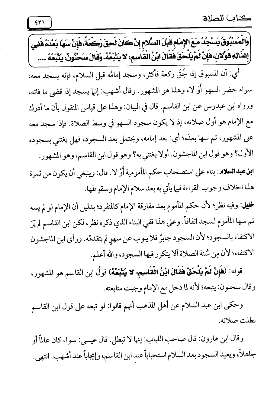 خليل: وفيه نظر, لأن حكم المأموم بعد مفارقة الإمام كالمنفرد, بدليل أن الإمام لو لم يسه ثم سها المأموم لسجد اتفاقا. وعلى هذا ففى البناء الذى ذكره نظر, لكن ابن القاسم لم يَرَ الاكتفاء بالسجود, لأن السجودجابر فلا ينوب عن سهو لم يتقدمه. ورأى ابن الماجشون الاكتفاء, لأن من سنة الصلاة ألا يتكرر فيها السجود, والله أعلم.