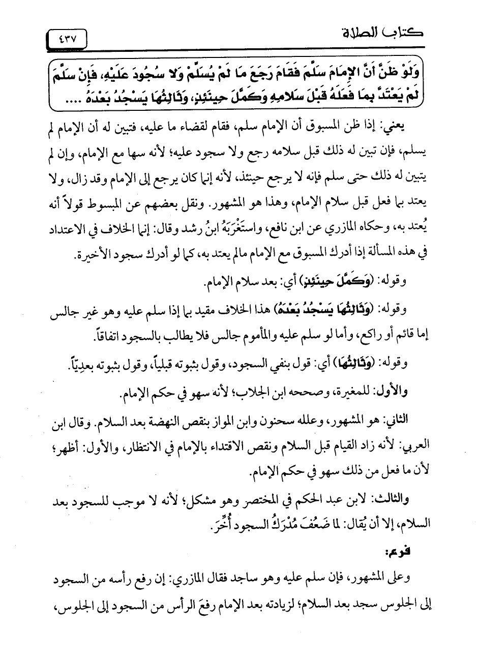 الثانى: هو المشهور, وعلله سحنون وابن المواز بنقص النهضة بعد السلام. وقال ابن العربى: لأنه زاد القيام قبل السلام ونقص الاقتداء بالإمام فى الانتظار, والأول: اظهر, لأان ما فعل من ذلك سهو فى حكم الإمام.