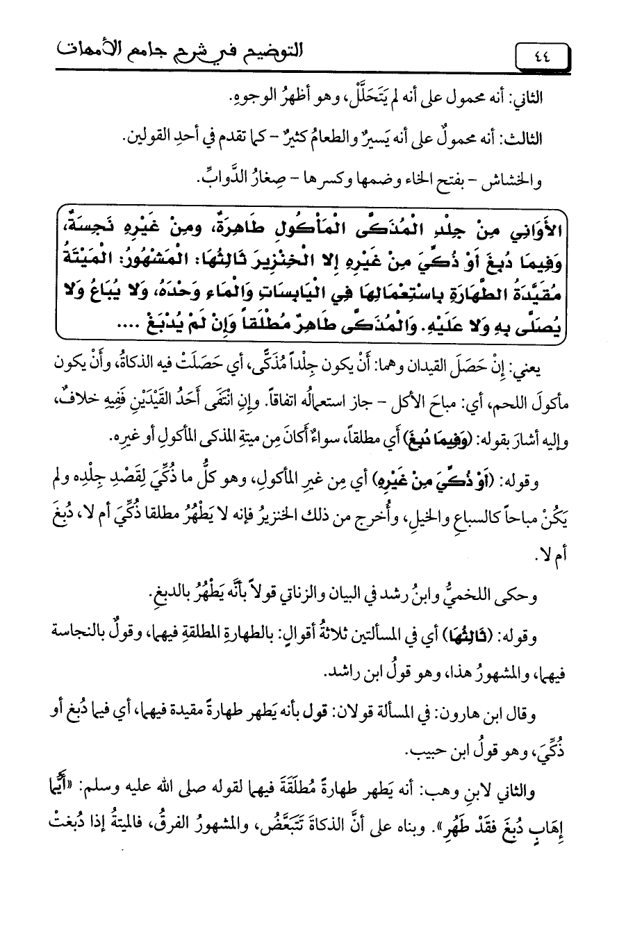 الأَوَانِي مِنْ جِلْدِ الْمُذَكَّى الْمَاكُولِ طَاهِرَةٌ، ومِنْ غَيْرِهِ نَجِسَةٌ، وَفِيمَا دُبِغَ أَوْ ذُكِّيَ مِنْ غَيْرِهِ إِلا الْخِنْزِيرَ ثَالِثُها: الْمَشْهُورِ: الْمَيْتَةُ مُقَيَّدَةُ الطَّهَارَةِ بِاسْتِعْمَالِهَا فِي الْيَابِسَاتِ وَالْمَاءِ وَحْدَهُ، وَلا يُبَاعُ وَلا يُصَلَّى بِهِ وَلا عَلَيْهِ. وَالْمُذَكَّى طَاهِرٌ مطلقاً وَإِنْ لَمْ يُدْبَغْ .....
