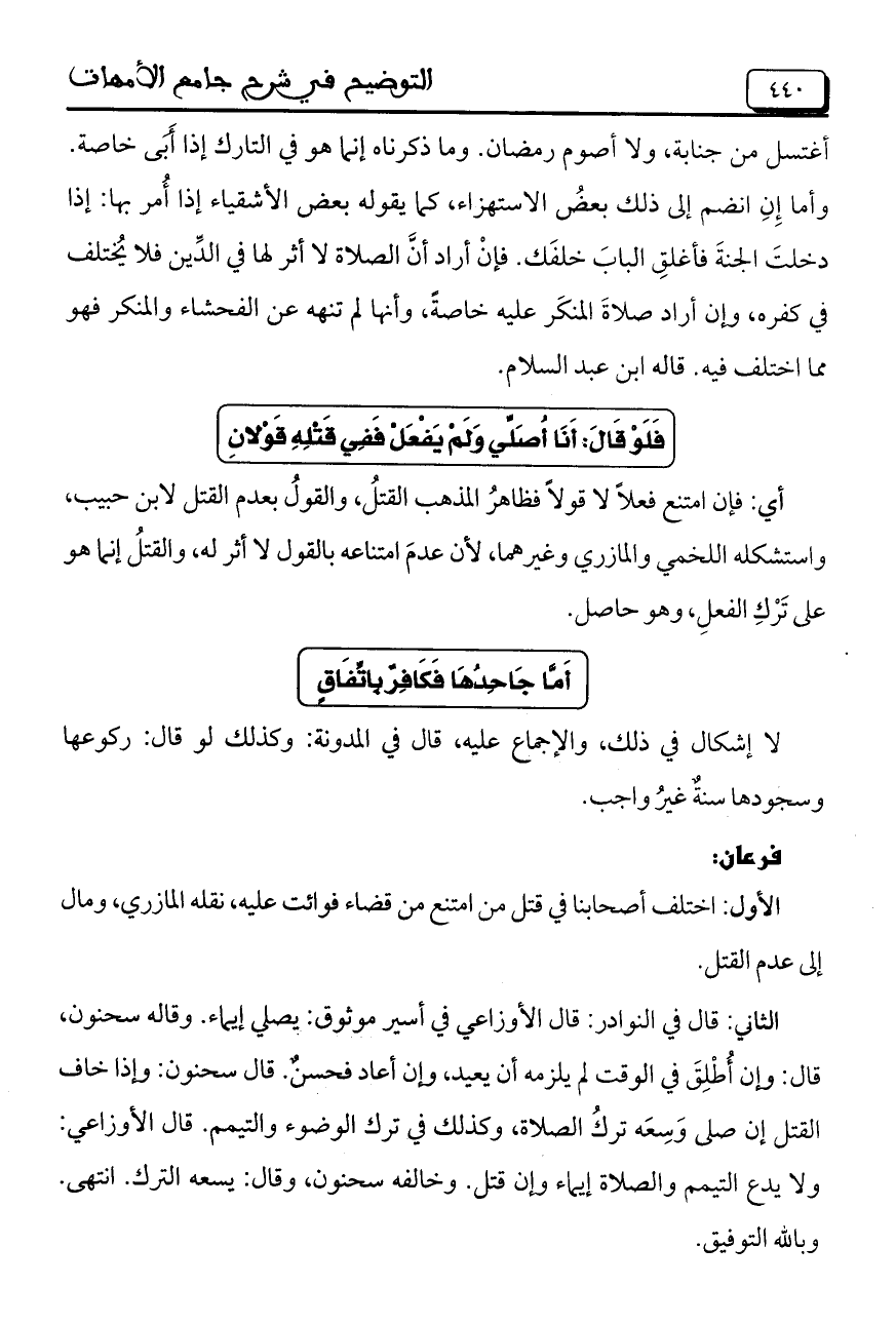 أغتسل من جنابة, ولا أصوم رمضان. وما ذكرناه إنما هو فى التارك إذا أَبَى خاصة. وأما إِنِ انضم إلى ذلك بعضُ الاستهزاء, كما يقوله بعض الأشقياء إذا أُمر بها: إذا دخلتَ الجنةَ فأغلِق البابَ خلفَك. فإنْ أراد أنَّ الصلاة لا أثر لها فى الدِّين فلا يُختلف فى كفره, وإن أراد صلاةَ المنكَر عليه خاصةً, وأنها لم تنهه عن الفحشاء والمنكر فهو مما اختلف فيه. قاله ابن عبد السلام.