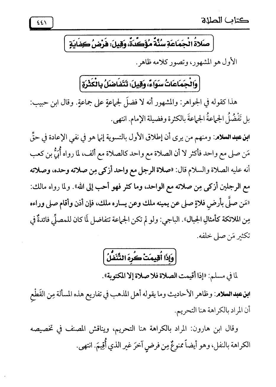 ابن عبد السلام: ومنهم من يرى ان إطلاق الأول بالتسوية إنما هو فى نفى الإعادة فى حقِّ مَن صلى مع واحد فاكثر لا أن الصلاة مع واحد كالصلاة مع ألف, لما رواه أُبَىُّ بن كعب أنه عليه الصلاة والسلام قال: "صلاة الرجل مع واحد أزكى من صلاته وحده, وصلاته مع الرجلين أزكى مِن صلاته مع الواحد, وما كثر فهو أحب إلى الله". ولما رواه مالك: "مَن صلَّى بأرضِ فلاةٍ صلى عن يمينه ملك وعن يسارة ملك, فإن أذن وأقام صلى وراءه مِن الملائكة كأمثالِ الجبال". الباجى: ولو لم تكن الجماعه تتفاضل لمَا كان للمصلِّى فائدةٌ فى تكثير مَن صلى خلفة.
