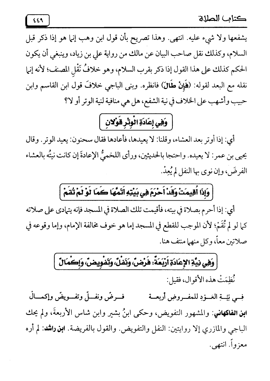 يشفعها ولا شيء عليه. انتهى. وهذا تصريح بأن قول اين وهب إنما هو إذا ذكر قبل السلام, وكذلك نقل صاحب البيان عن مالك من رواية على بن زياد, وينبغى أن يكون الحكم كذلك على هذا القول إذا ذكر بقرب السلام, وهو خلافُ نَقْلِ المصنف؛ لأنه إنما نقله مع البعد لقوله: (فَإِنْ طَالَ) فانظره. وبنى الباجي خلافَ قول ابن القاسم وابن حبيب وأشهب على الخلاف فى نبة الشفع, هل هي منافية لنية الوتر أو لا؟