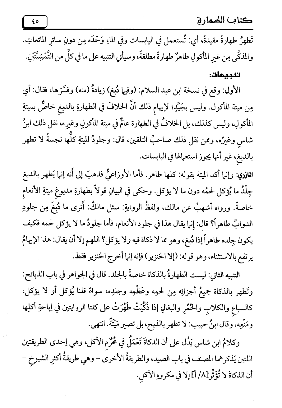 التنبيه الثاني: ليست الطهارةُ بالذكاة خاصةً بالجلد. قال في الجواهر في باب الذبائح: وتَطهر بالذكاة جميعُ أجزائه من لحمه وعظمه وجلده، سواء قلنا يُؤكل أو لا يؤكل، كالسباع والكلاب ولحمر والبغال إذا ذكيت طهرت على كلتا الروايتين في إباحة أكلها ومَنْعِه، وقال ابنُ حبيب: لا تطهر بالذبح، بل تصير مَيْتَةً. انتهى.