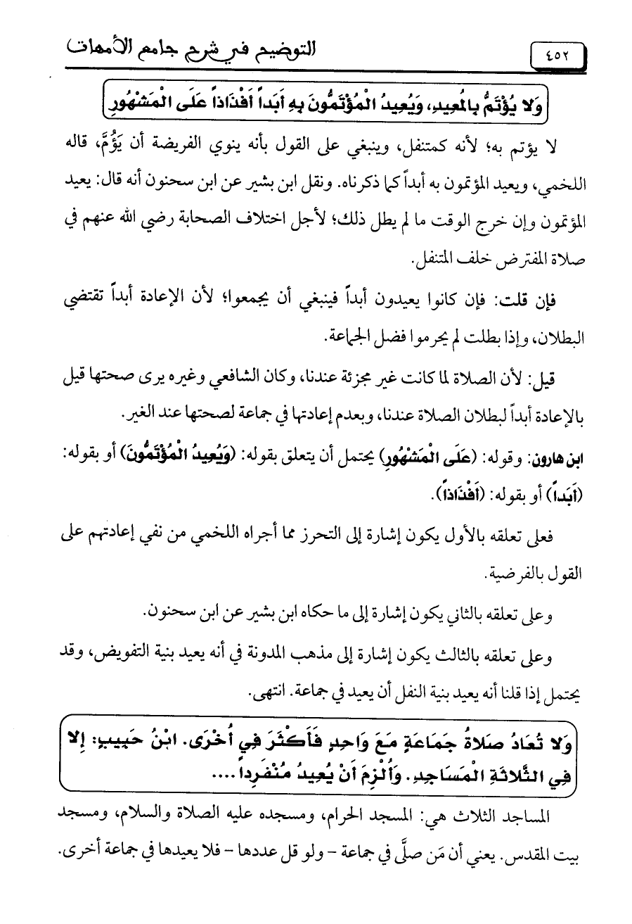 ابن هارون: وقوله: (عَلَى الْمَشْهُورِ) يحتمل أن يتعلق بقوله: (وَيُعِيدُ الْمُؤْتَمُّونَ) أو بقوله: (أَبَداً) أو بقوله: (أَفْذَاذاً).