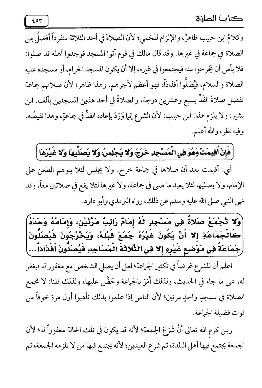وَلا تُجْمَعُ صَلاةٌ فِي مَسْجِدٍ لَهُ إِمَامٌ رَاتِبٌ مَرَّتَيْنِ، وَإِمَامُهُ وَحْدهُ كَالْجَمَاعَةِ إِلا أَنْ يَكُونَ غَيْرُهُ جَمَعَ قَبْلَهُ، وَيَخْرُجُونَ فَيُصَلُّونَ جَمَاعَةً فِي مَوْضِعٍ غَيْرِه إِلا فِي الثَّلاثَةَ الْمَسَاجِدِ فَيُصَلُّونَ أَفْذَاذاً .....