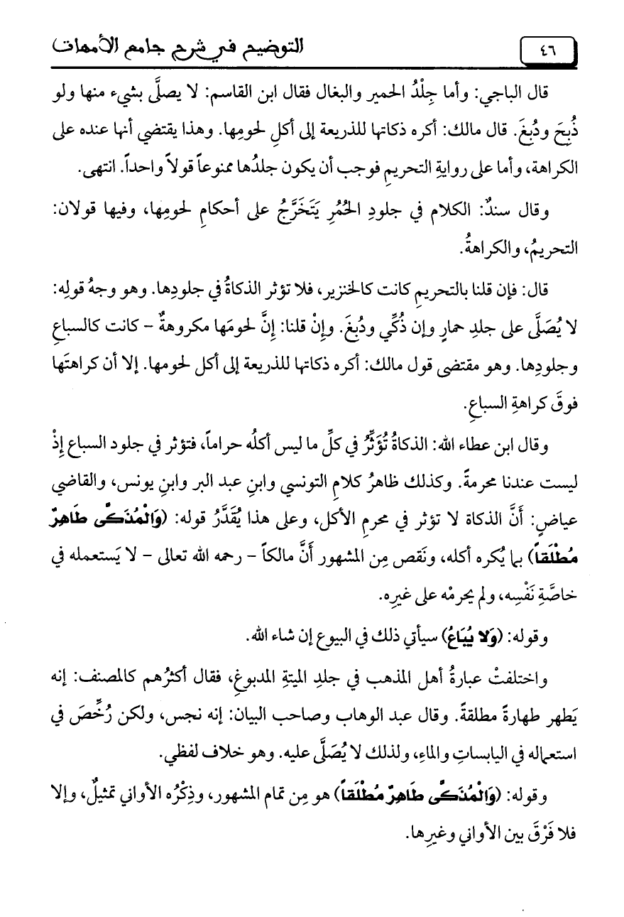 وقال ابن عطاء الله: الذكاةُ تُؤَثِّرُ في كلِّ ما ليس أكلُه حراماً، فتؤثر في جلود السباع إِذْ ليست عندنا محرمةً. وكذلك ظاهرُ كلامِ التونسي وابن عبد البر وابن يونس، والقاضي غياضِ: أَنَّ الذكاة لا تؤثر في محرمِ الأكل، وعلى هذا يُقَدَّرُ قوله: (وَالْمُذَكَّى طَاهِرٌ مطلقاً) بما يُكره أكله، ونَقص مِن الْمَشْهُورِ أَنَّ مالكاً- رحمه الله تعالى- لا يَستعمله في خاصَّةِ نَفْسِه، ولم يحرمْه على غيرِه.