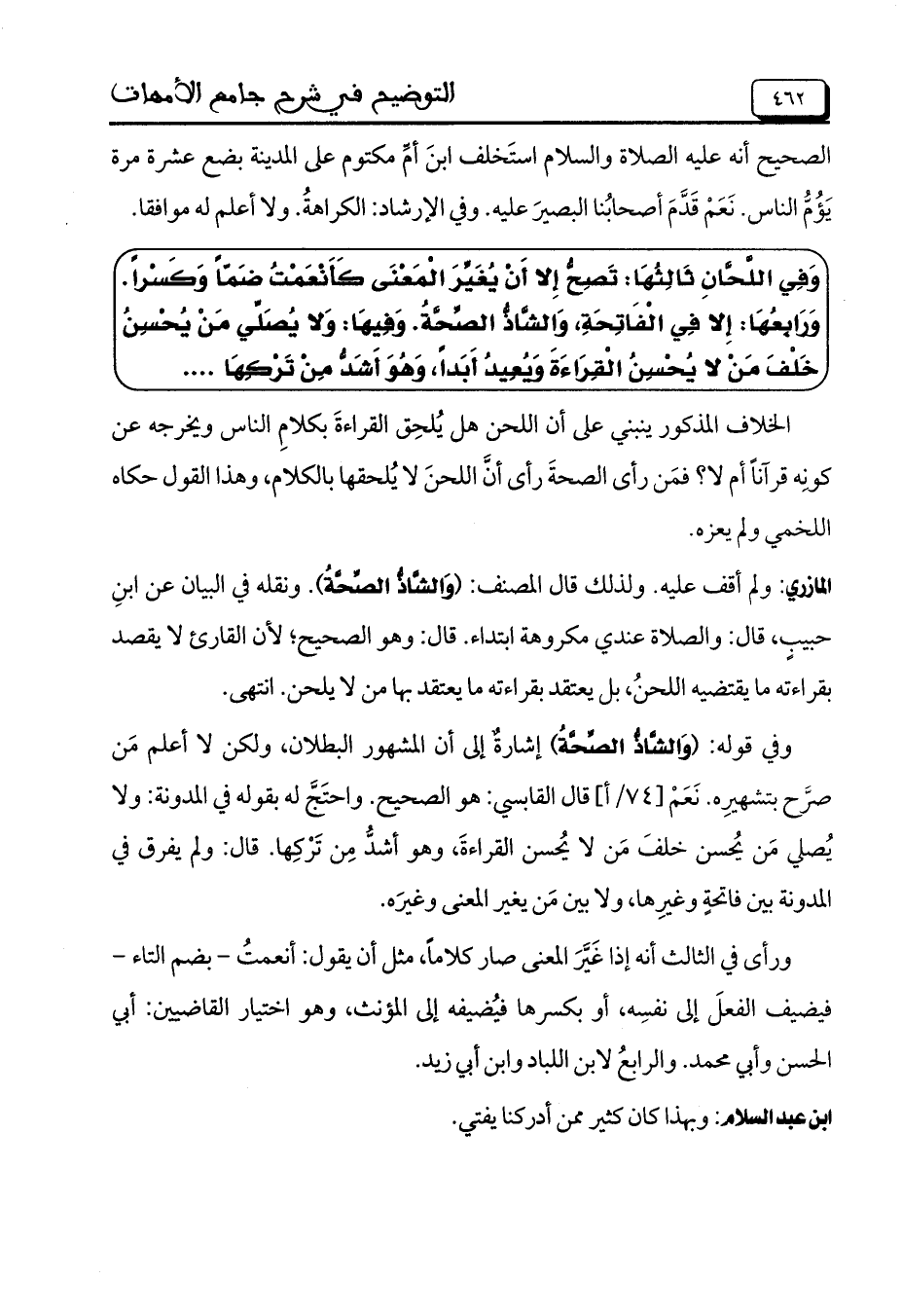 المازري: ولم أقف عليه. ولذلك قال المصنف: (وَالشَّاذُّ الصَّحَّةُ). ونقله في البيان عن ابنِ حبيبٍ، قال والصلاة عندي مكروهة ابتداء. قال وهو الصحيح؛ لأن القارئ لا يقصد بقراءته ما يقتضيه اللحنُ، بل يعتقد بقراءته ما يعتقد ما من لا يلحن. انتهى.