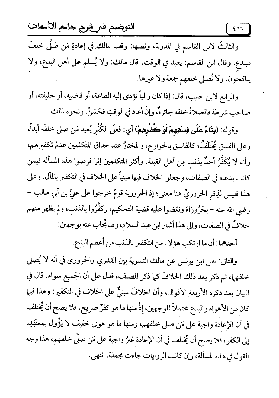 والثاني: نقل ابن يونس عن مالك التسوية بين القدري والحروري في أنه لا يُصلى خلفهما، ثم ذكر بعد ذلك الخلافَ كما ذكر المصنف، فدل على أن الجميع سواء. قال في البيان بعد ذكره الأربعة الأهوال، وأن الخلافَ مبنيٌّ على الخلاف في التكفير: وهذا فيما كان من الأهواء والبدع محتملاً للوجهين، إذ منها ما هو كفٌر صرح، فلا يصح أن يُختلف في أن الإعادة واجبة على من صلى خلفهم، ومنها ما هو هوى خفيف لا يَؤُول بمعتَقِدِه إلى الكفر، فلا يصح أن يُختلف في أن الإعادة غيرُ واجبة على مَن صلَّى خلفهم، هذا وجه القول في هذه المسألة، وإن كانت الروايات جاءت مجملة. انتهى.