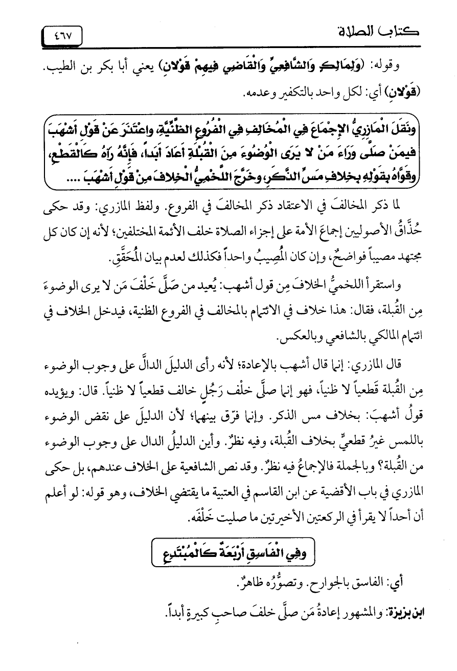 قال المازري: إنما قال أشهب بالإعادة؛ لأنه رأى الدليلَ الدالَّ على وجوب الوضوء مِن القُبلة قطعياً لا ظنياً، فهو إنما صلَّى خلف رَجُلٍ خالف قطعياً لا ظنياً. قال: ويؤيده قولُ أشهبَ: بخلاف مس الذكر. وإنما فرّق بينهما؛ لأن الدليلَ على نقض الوضوء باللمس غيرُ قطعيِّ بخلاف القُبلة، وفيه نظرٌ. وأين الدليلُ الدال على وجوب الوضوء من القُبلة؟ وبالجملة فالإجماعُ فيه نظرٌ. وقد نص الشافعية على الخلاف عندهم، بل حكى المازري في باب الأقضية عن ابن القاسم في العتبية ما يقتضي الخلاف، وهو قوله: لو أعلمأن أحداً لا يقرأ في الركعتين الأخيرتين ما صليت خَلْفَه.
