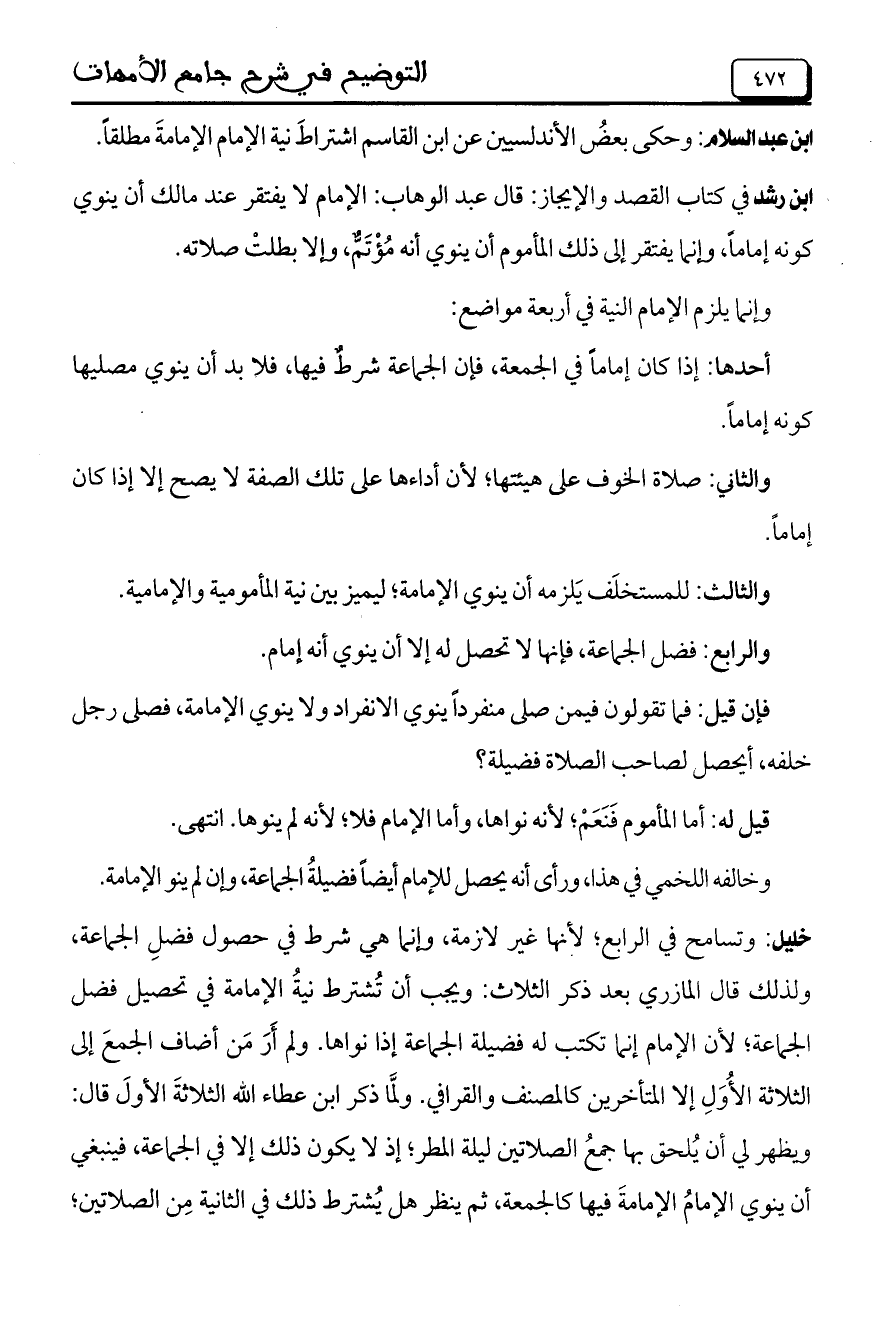 ابن عبد السلام: وحكى بعضُ الأندلسيين عن ابن القاسم اشتراطَ نية الإمام الإمامةَ مطلقاً.