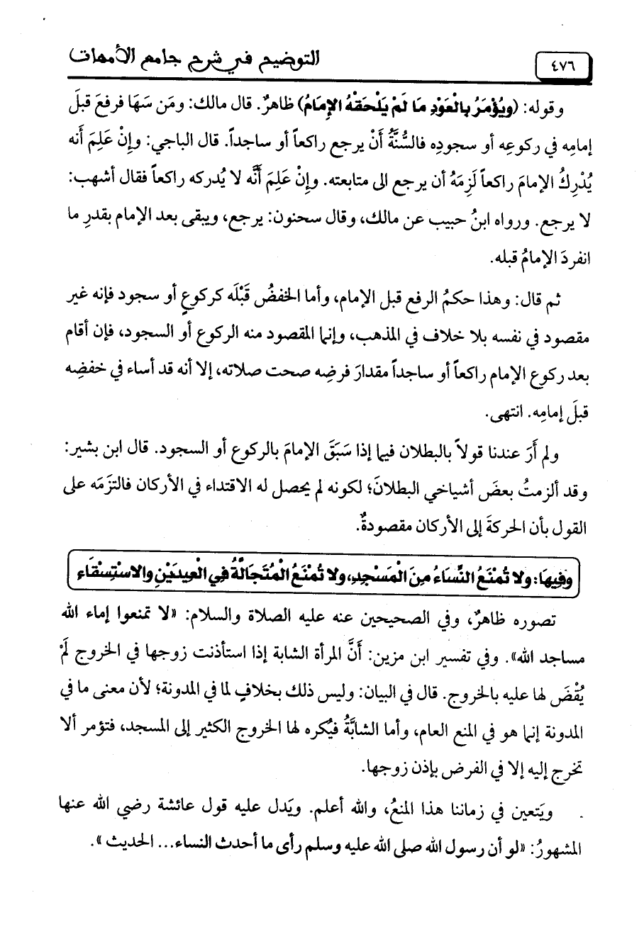 تصوره ظاهرٌ، وفي الصحيحين عنه عليه الصلاة والسلام: "لا تمنعوا إماء الله مساجد الله". وفي تفسير ابن مزين: أَنَّ المرأة الشابة إذا استأذنت زوجها في الخروج لَمْ يُقْضَ لها عليه بالخروج. قال في البيان: وليس ذلك بخلافٍ لما في المدونة؛ لأن معنى ما في المدونة إنما هو في المنع العام، وأما الشابَّةُ فيُكره لها الخروج الكثير إلى المسجد، فتؤمر ألا تخرج إليه إلا في الفرض بإذن زوجها.