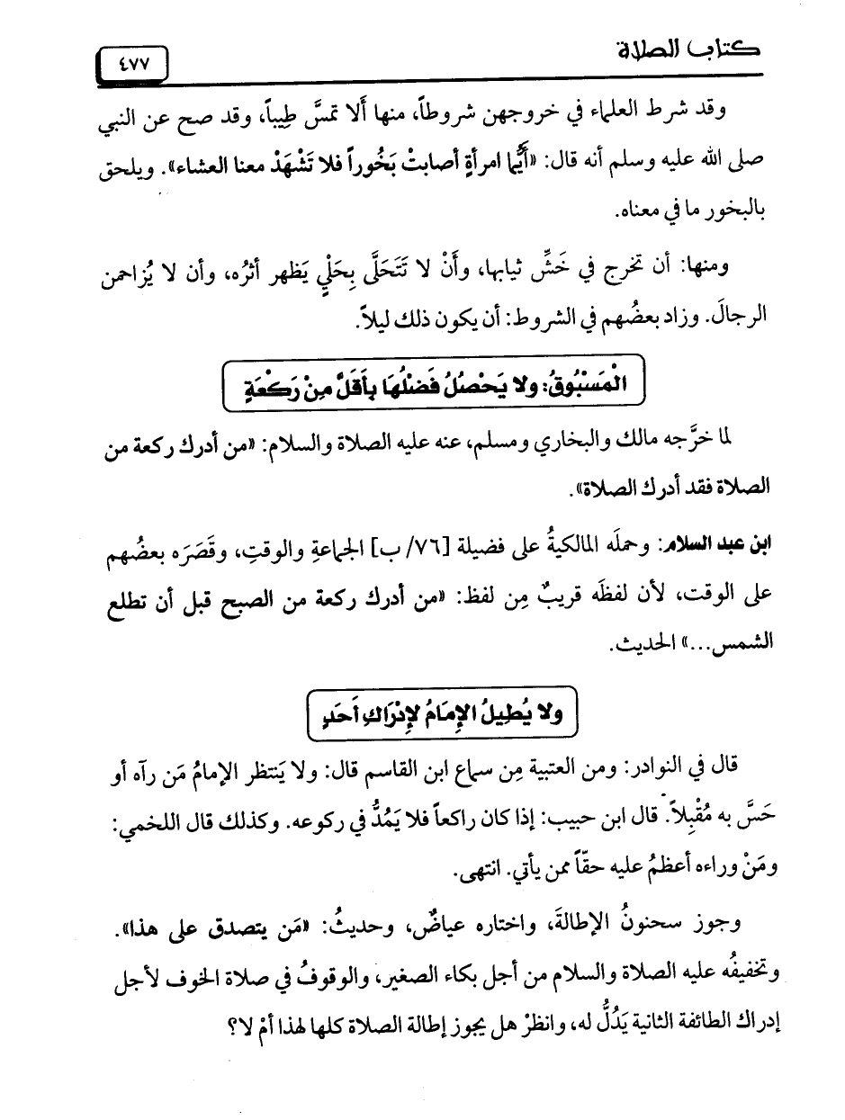 ابن عبد السلام: وحملَه المالكيةُ على فضيلة [76/ ب] الجماعةِ والوقتِ، وقَصَرَه بعضُهم على الوقت، لأن لفظَه قريبٌ مِن لفظ: "من أدرك ركعة من الصبح قبل أن تطلع الشمس .... " الحديث.