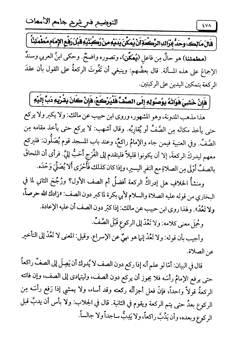 قَالَ مَالِكً: وحَدُّ إِدْرَاكِ الرَّكْعَةِ أَنْ يُمَكَّنَ يَدَيْهِ مِنْ رُكْبَتَيْهِ قَبْلَ رَفْعِ الإِمَامَ مُطْمَئِناً