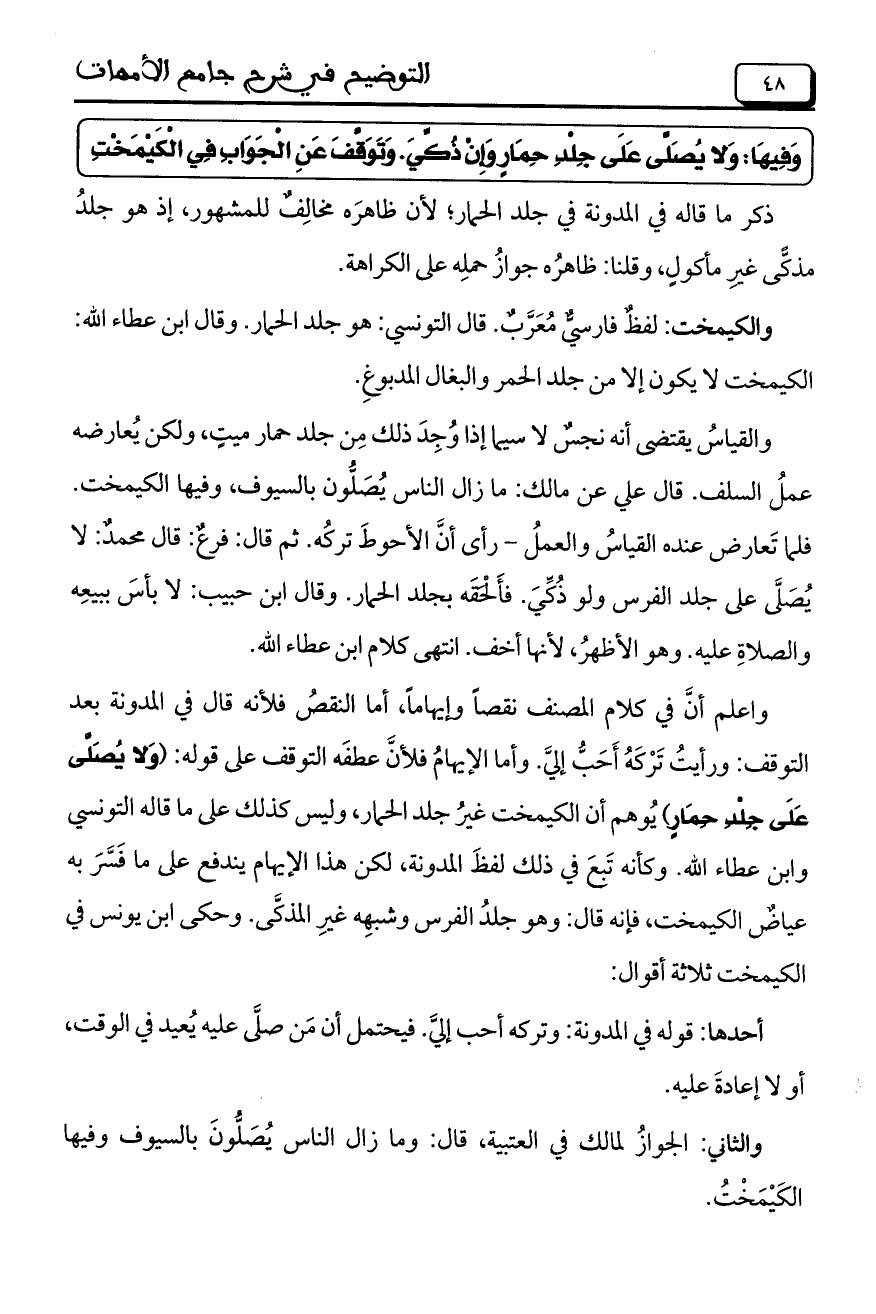 واعلم أنَّ في كلام المصنف نقصاً وإيهاماً، أما النقصُ فلأنه قال في المدونة بعد التوقف: ورأيتُ تَرْكَهُ أَحَبُّ إليَّ. وأما الإيهامُ فلأنَّ عطفَه التوقف على قوله: (وَلا يُصَلَّى عَلَى جِلْدِ حِمَارٍ) يُوهم أن الكيمخت غيرُ جلد الحمار، وليس كذلك على ما قاله التونسي وابن عطاء الله. وكأنه تَبعَ في ذلك لفظَ المدونة، لكن هذا الإيهام يندفع على ما فَسَّرَ به عياضٌ الكيمخت، فإنه قال: وهو جلدُ الفرس وشبهِه غيرِ المذكَّى. وحكى ابن يونس في الكيمخت ثلاثة أقوال: