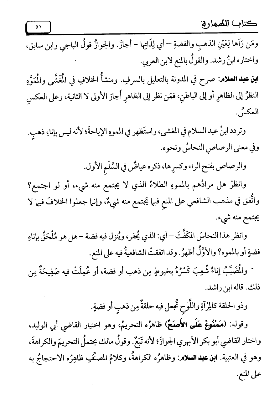 ومَن رَآها لِعَيْنِ الذهبِ والفضةِ- أي لِذَاتِها- أجازَ. والجوازُ قولُ الباجي وابن سابق، واختاره ابنُ رشد. والقولُ بالمنع لابن العربي.