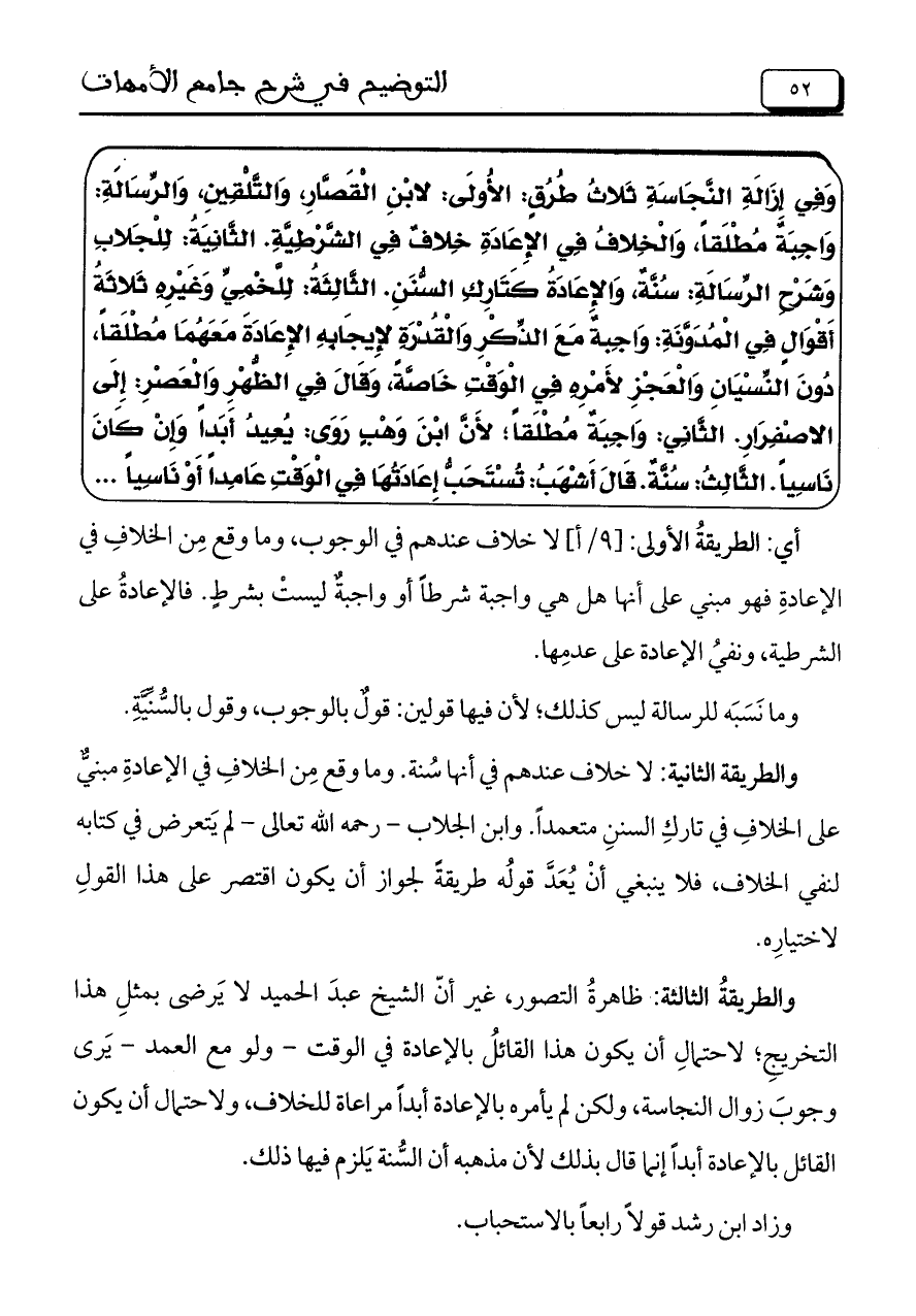 أي: الطريقةُ الأولى: [9/أ] لا خلاف عندهم في الوجوب، وما وقع مِن الخلافِ في الإعادةِ فهو مبني على أنها هل هي واجبة شرطاً أو واجبةٌ ليست بشرطٍ. فالإعادةُ على الشرطية، ونفيُ الإعادة على عدمِها.