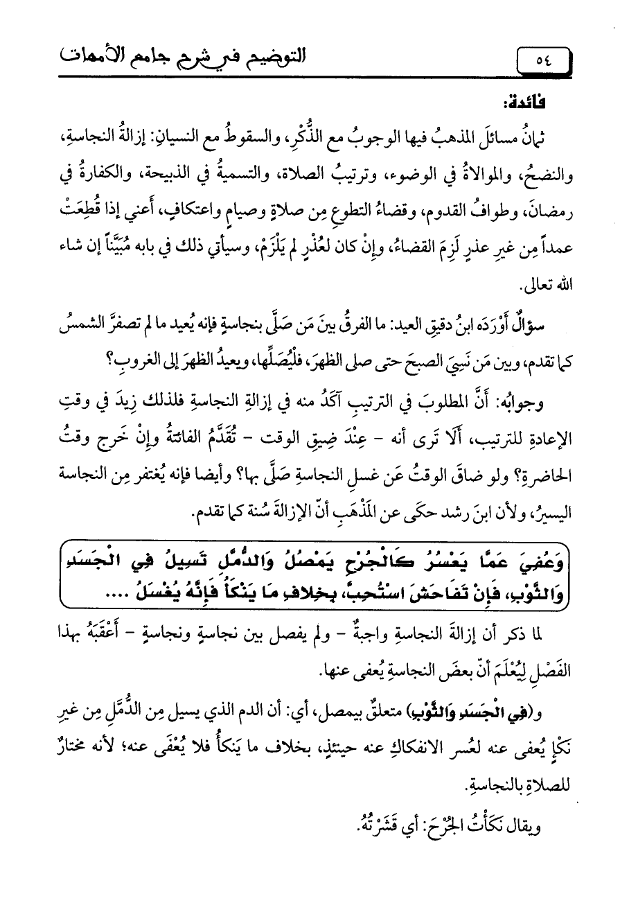 ثمانُ مسائلَ المذهبُ فيها الوجوبُ مع الذُّكْرِ، والسقوطُ مع النسيانِ: إزالةُ النجاسةِ، والنضحُ، والموالاةُ في الوضوء، وترتيبُ الصلاة، والتسميةُ في الذبيحة، والكفارةُ في رمضانَ، وطوافُ القدوم، وقضاءُ التطوعِ مِن صلاةٍ وصيامٍ واعتكافٍ، أَعنى إذا قُطِعَتْ عمداً مِن غيرِ عذرٍ لَزِمَ القضاءُ، وإِنْ كان لعُذْرٍ لم يَلْزَمْ، وسيأتي ذلك في بابه مُبَيَّناً إن شاء الله تعالى.