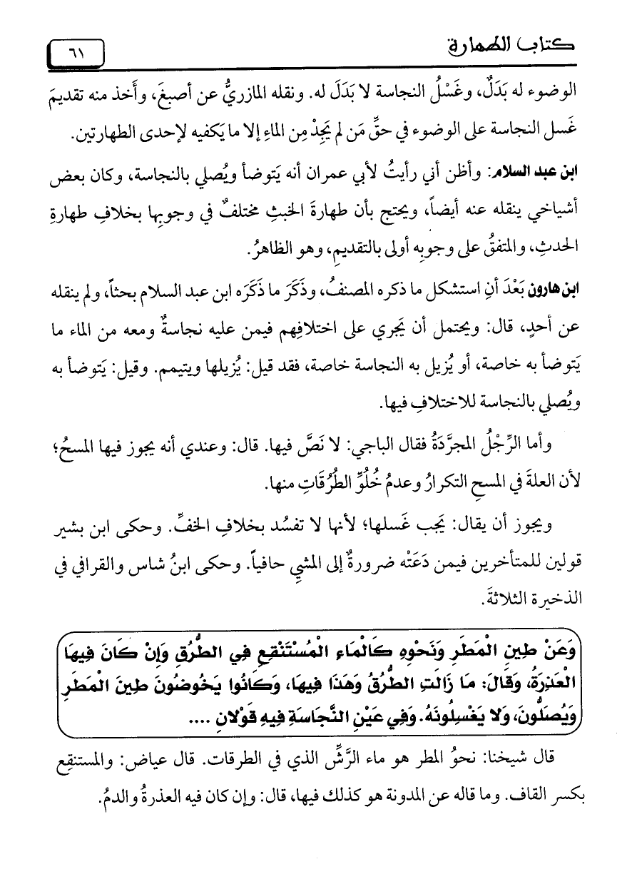 ابن عبد السلام: وأظن أني رأيتُ لأبي عمران أنه يَتوضأ ويُصلي بالنجاسة، وكان بعض أشياخي ينقله عنه أيضاً، ويحتج بأن طهارةَ الخبثِ مختلفٌ في وجوبِها بخلاف طهارةِ الحدثِ، والمتفقُ على وجوبِه أولى بالتقديمِ، وهو الظاهرُ.