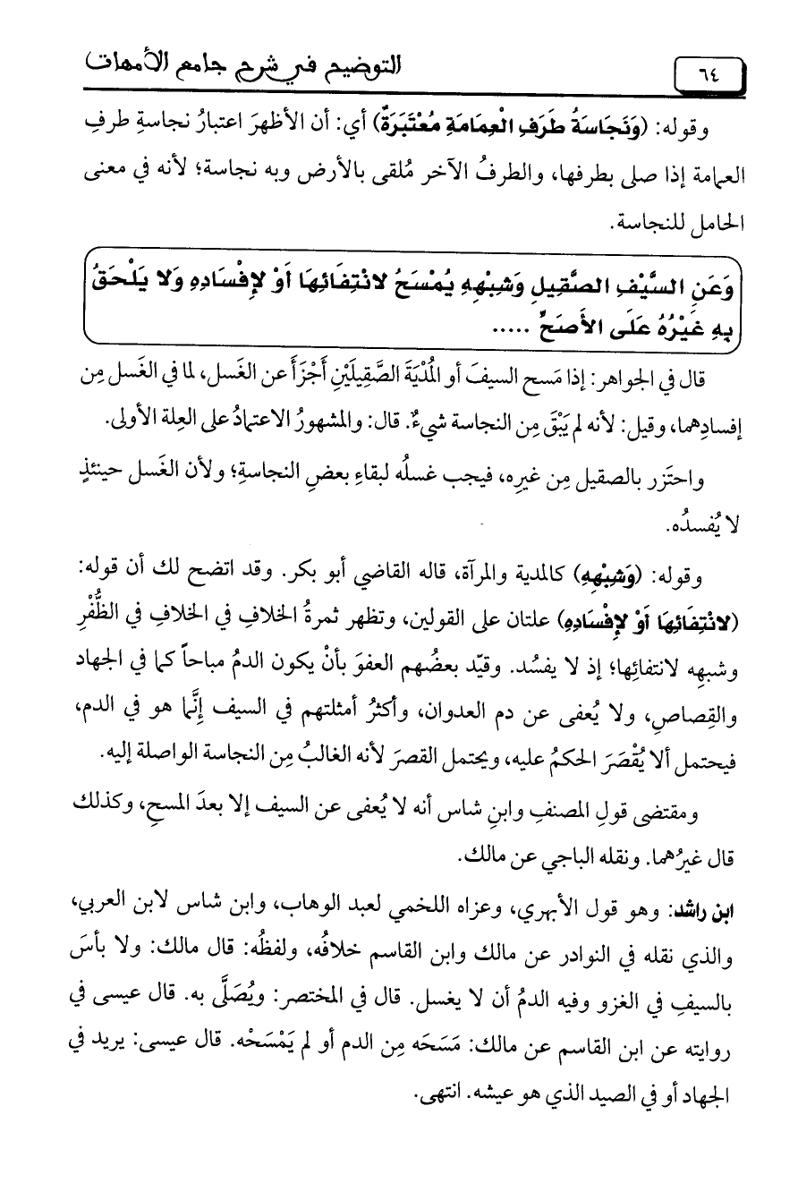 ابن راشد: وهو قول الأبهري، وعزاه اللخمي لعبد الوهاب، وابن شاس لابن العربي، والذي نقله في النوادر عن مالك وابن القاسم خلافُه، ولفظُه: قال مالك: ولا بأسَ بالسيفِ في الغزو وفيه الدمُ أن لا يغسل. قال في المختصر: ويُصَلَّى به. قال عيسى في روايته عن ابن القاسم عن مالك: مسحه من الدم أو لم يَمْسَحْه. قال عيسي: يريد في الجهاد أو في الصيد الذي هو عيشه. انتهى.